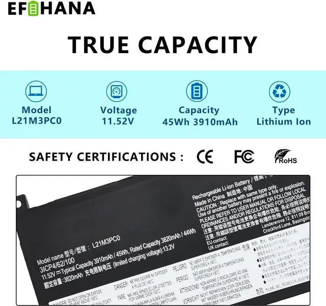 SpecificationsModel:L21M3PC0 // Battery type: Li-ion // Voltage:11.52V// Capacity:45Wh 3910mAh// 100% New from Manufacturer. Top circuit boards and smart chip.