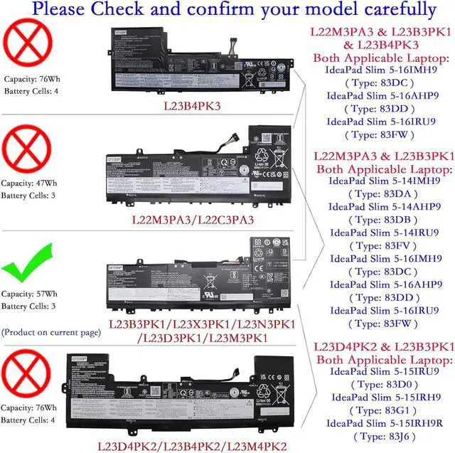 Compatible with Laptop Models For Lenovo IdeaPad Slim 5-15IRH9R ( Type: 83J6 ) Series; For Lenovo IdeaPad Slim 5-14Q8X9 ( Type: 83HL ) Series.(Note: There are three batteries with different capacities (L22M3PA3 L22C3PA3 47Wh, L23B4PK3 76Wh and L23N3PK1 L23B3PK1 L23X3PK1 L23D3PK1 L23M3PK1 57Wh), This is for the IdeaPad Slim series, and does not apply to the IdeaPad Pro series, which use different types of batteries. You can open the back cover of the laptop to check the original battery model and purchase the correct model.)