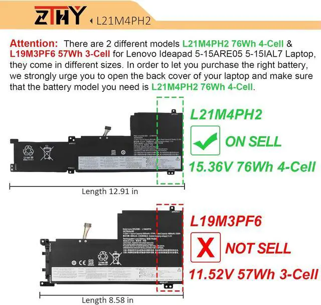 Attention: There are 2 different models L21M4PH2 76Wh 4-Cell & L19M3PF6 57Wh 3-Cell for Lenovo Ideapad 5-15ARE05 5-15IAL7 Laptop, they come in different sizes. In order to let you purchase the right battery, we strongly urge you to open the back cover of your laptop and make sure that the battery model you need is L21M4PH2 76Wh 4-Cell