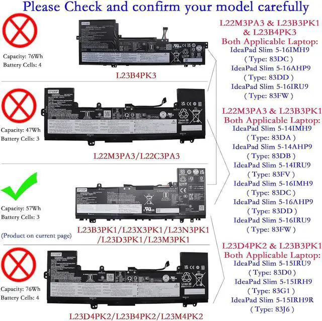 Compatible with Laptop Models For Lenovo IdeaPad Slim 5-15IRH9R ( Type: 83J6 ) Series; For Lenovo IdeaPad Slim 5-14Q8X9 ( Type: 83HL ) Series.(Note: There are three batteries with different capacities (L22M3PA3 L22C3PA3 47Wh, L23B4PK3 76Wh and L23N3PK1 L23B3PK1 L23X3PK1 L23D3PK1 L23M3PK1 57Wh), they are compatible with different computer models. You can open the back cover of the laptop to check the original battery model and purchase the correct model)