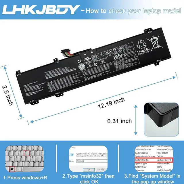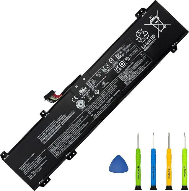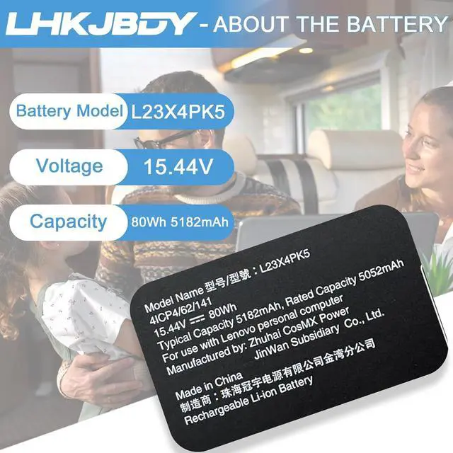 Specifications: Type: L23X4PK5; Voltage: 15.44V; Capacity: 5182mAh/80Wh; Color: Black. Battery type: Lithium-Ion; The Packages includes: 1pcs L23X4PK5 Laptop Battery Replacement, 2pcs Screwdrivers, 1 pcs Instruction for L23X4PK5 Battery. The batteries are certified by UL and CE, ensuring safety and high performance