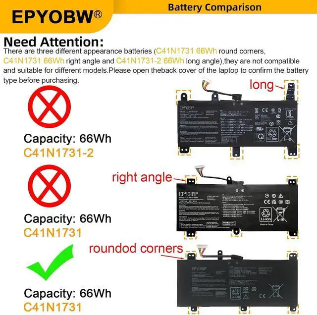 (Note: There are three different appearance batteries (C41N1731 66Wh round corners, C41N1731 66Wh right angle and C41N1731-2 66Wh long angle), they are not compatible and suitable for different models.Please open the back cover of the laptop to confirm the battery type before purchasing.)