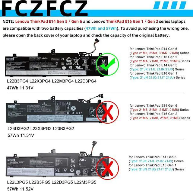 Compatible with Machine Models for Lenovo ThinkPad E14 Gen 5 (Type: 21JK 21JL 21JR 21JS) Series; for Lenovo ThinkPad E16 Gen 1 (Type: 21JN 21JQ 21JT 21JU) Series; for Lenovo ThinkPad E14 Gen 6 (Type: 21M3 21M4 21M7 21M8) Series; for Lenovo ThinkPad E16 Gen 2 (Type: 21MA 21MB 21M5 21M6) Series. (NOTE: These laptop series are all compatible with two battery capacities (47Wh and 57Wh). To avoid purchasing the wrong one, please open the back cover of your laptop and check the capacity of the original battery.)