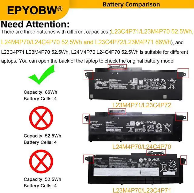 Compatible with Laptop Models For Lenovo ThinkPad T16 Gen 3 (Type 21MN, 21MQ) Series; For Lenovo ThinkPad P16s Gen 4 (Type 21QR, 21QS) Series; For Lenovo ThinkPad T16 Gen 4 (Type 21QE, 21QF, 21QN, 21QQ) Series.(Note: There are three batteries with different capacities (L23C4P71 L23M4P70 52.5Wh, L24M4P70 L24C4P70 52.5Wh and L23C4P72 L23M4P71 86Wh), and L23C4P71 L23M4P70 52.5Wh, L24M4P70 L24C4P70 52.5Wh is suitable for different laptops. You can open the back of the laptop to check the original battery model)