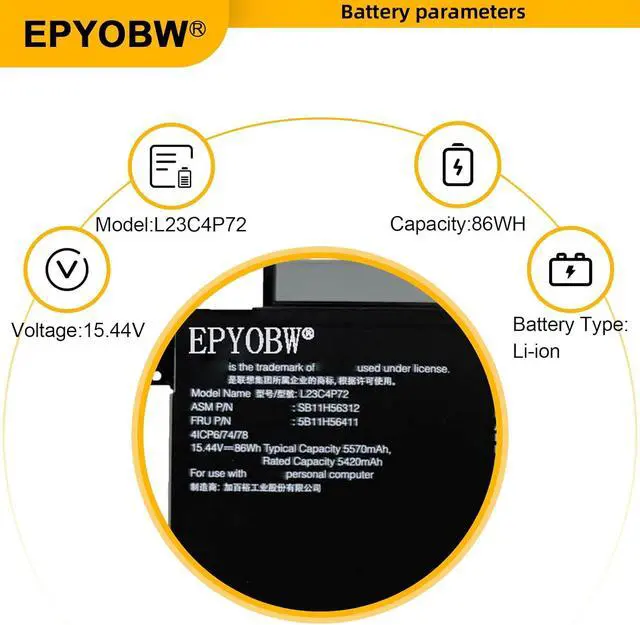 Specifications Battery Model: L23C4P72 / Voltage: 15.44V / Capacity: 86Wh 5570mAh 4-Cell / Color: Black / Condition: Brand New.