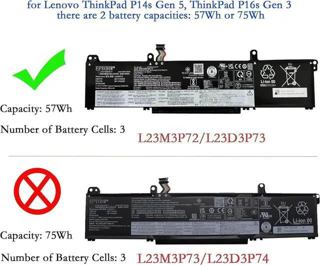 Compatible with Laptop ModelsFor Lenovo ThinkPad P14s Gen 5 ( Type: 21G2 21G3 ) Series; For Lenovo ThinkPad P16s Gen 3 ( Type: 21KS 21KT ) Series.( NOTE: There are two capacities here (L23M3P73 L23D3P74 75Wh and L23M3P72 L23D3P73 57Wh), and they are compatible with ThinkPad P14s Gen 5 (Type 21G2, 21G3) instead of ThinkPad P14s Gen 5 (Type: 21ME 21MF). You can open the back of the laptop to check the original battery model.)