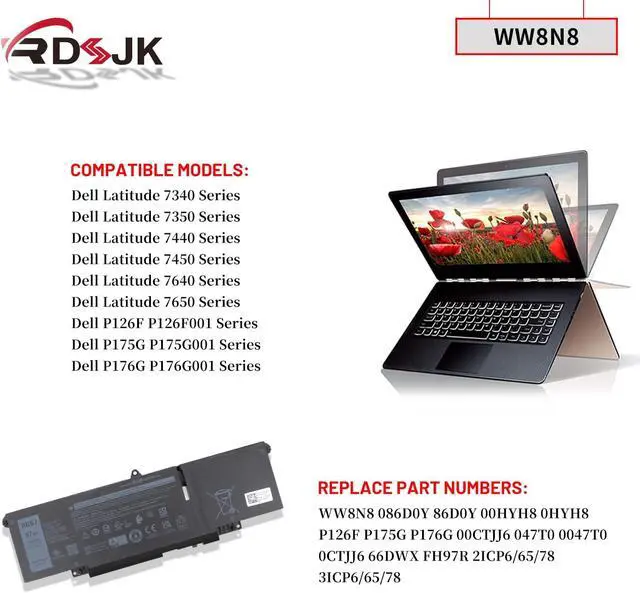 Compatible Models: Replacement for Dell Latitude 7340 7350 7440 7450 7640 7650 Series, for Dell P126F P126F001 P175G P175G001 P176G P176G001 Series