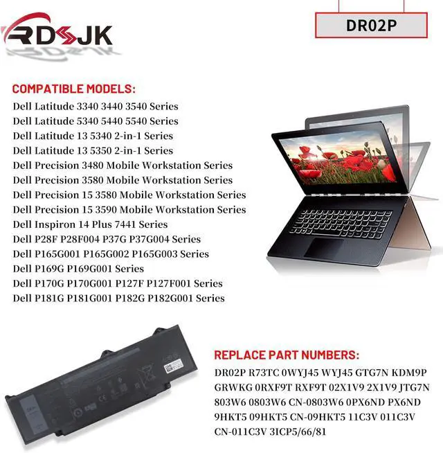 Compatible Models: Replacement for Dell Latitude 3340 3440 3540 5340 5440 5540 Series, for Dell Latitude 13 5340 5350 2-in-1 Series, for Dell Precision 3480 3580 Mobile Workstation Series, for Dell Precision 15 3580 3590 Mobile Workstation Series, for Dell Inspiron 14 Plus 7441 Series, for Dell P28F P28F004 P37G P37G004 Series, for Dell P165G001 P165G002 P165G003 P169G P169G001 Series, for Dell P170G P170G001 P127F P127F001 P181G P181G001 P182G P182G001 Series