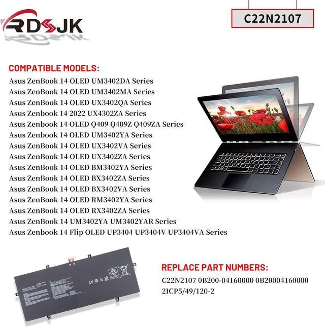 Compatible Models: Replacement for Asus ZenBook 14 OLED UM3402 UM3402DA UM3402MA UX3402QA Series, for Asus Zenbook 14 2022 UX4302ZA Series, for Asus Zenbook 14 OLED Q409 Q409Z Q409ZA Q409ZA-EVOI5256BL Series, for Asus ZenBook 14 OLED UX3402VA UX3402ZA Series, for Asus ZenBook 14 OLED BM3402YA BX3402ZA BX3402VA RM3402YA RX3402ZA UM3402YA UM3402YAR Series, for Asus Zenbook 14 Flip OLED UP3404 UP3404V UP3404VA Series