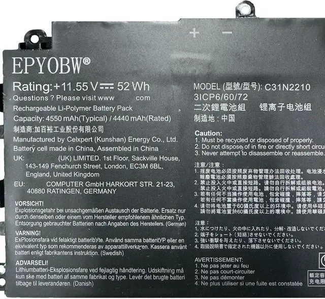 SpecificationsBattery Model: C31N2210 / Voltage: 11.55V / Capacity: 52Wh 4550mAh / Color: Black / Condition: Brand New.