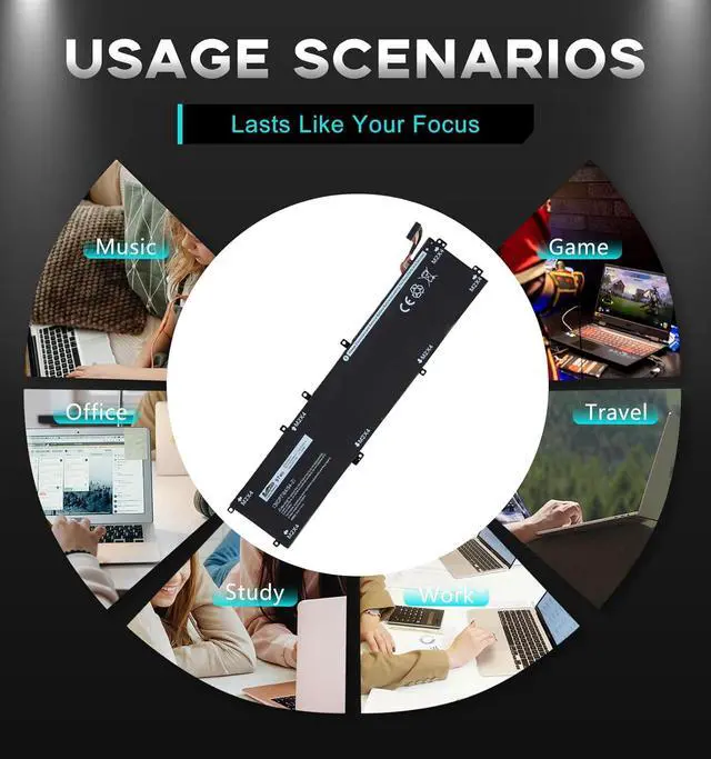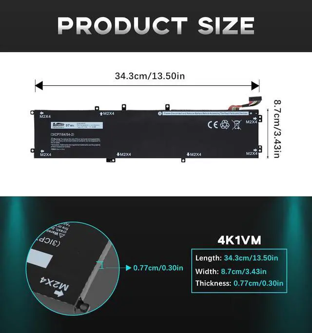 Specifications: Replacement Battery 4K1VM for Dell, Voltage: 11.4V, Capacity: 97Wh, 8509mAh, 6-Cell. Type: rechargeable Li-ion battery, Package includes: 1 x 4K1VM battery, 1 x 5-IN-1 Screwdriver toolkit, 1 x User Manual. All our brand replacement laptop batteries are 100% brand-new from manufacturer owned by ourselves GBLGBD.