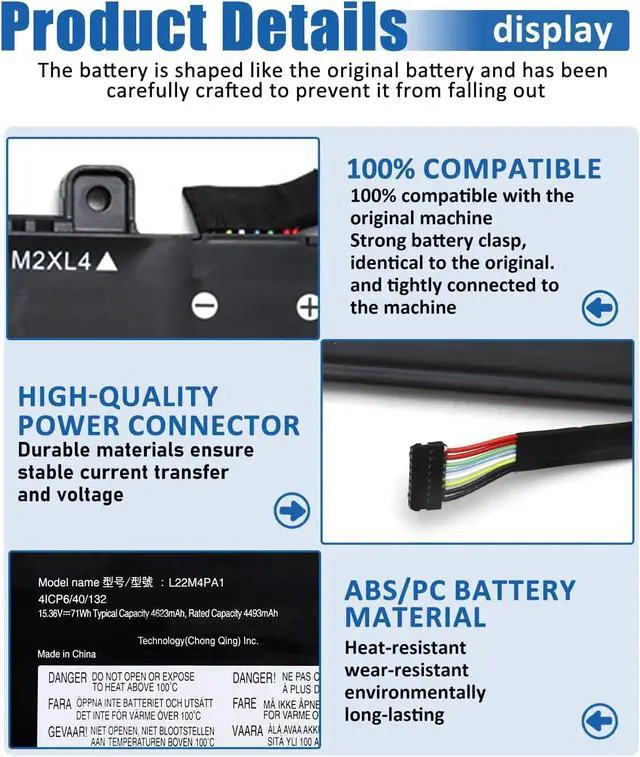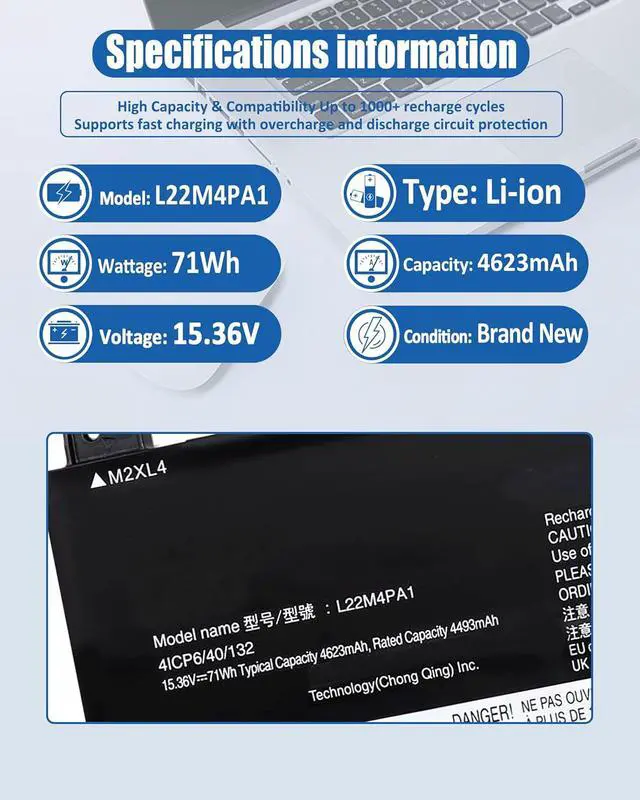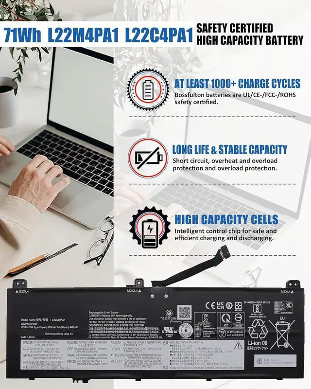 Premium Battery SpecificationsModel: L22M4PA1 Replacement Battery;Technology: High-quality Lithium-ion cells; Voltage: 15.36V Capacity: 71Wh / 4623mAh 4-cell; Configuration: 4-Cell design for extended runtime; Package Contents:1× L22M4PA1 Laptop Battery, 1×Professional screwdriver Kit, 1× Detailed instruction manual; Designed specifically for Lenovo Yoga 7 2-in-1 Series, 500+ charge cycles for long-term reliability Color: Black. Condition:100% Brand New. Manufacturer Warranty:One-year