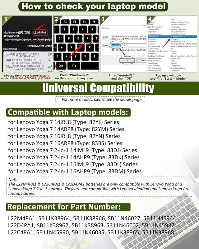 Compatible with Laptop Models71Wh L22M4PA1 Li-ion Battery Replacement for Lenovo Yoga 7-14ARP8 (Type 82YM) Series, for Lenovo Yoga 7-14IRL8 (Type 82YL) Series,for Lenovo Yoga 7-16ARP8 (Type 83BS) Series, for Lenovo Yoga 7-16IRL8 (Type 82YN) Series, Lenovo Yoga 7 2-in-1 14AHP9 (Type 83DK) Series, for Lenovo Yoga 7 2-in-1 14IML9 (Type 83DJ) Series, for Lenovo Yoga 7 2-in-1 16AHP9 (Type 83DM) Series, for Lenovo Yoga 7 2-in-1 16IML9 (Type 83DL) Series