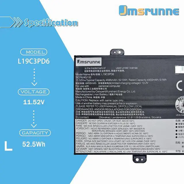 L19C3PD6 Specifications Model: L19C3PD6 ./ Voltage: 11.52V ./ Capacity: 52.5Wh /Battery type: Li-ion. /Battery life: Up to 1000 recharge cycles over the life of the battery. Also comes with installation tools.Purchasing Note: Due to the complexity of laptop battery models, you may not be able to accurately determine the model you need to purchase,Please open the back cover of the laptop to confirm the original battery model number