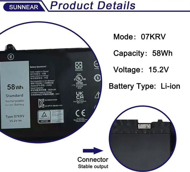 Specifications Model: 07KRV, Voltage: 15.2V; Capacity: 58Wh 3625mAh; Cells: 4-Cell; Color: Black; Type: Li-ion.Also comes with installation tools