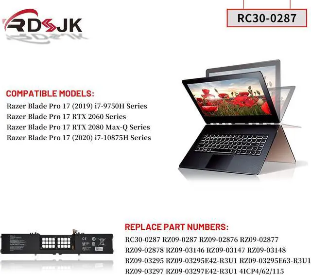 Compatible Models: Razer Blade Pro 17 (2019) i7-9750H Series: RZ09-0287 RZ09-02876 RZ09-02878 RZ09-02876E92-R3U1 RZ09-02876E92-R341 RZ09-02876E92-R3E1 RZ09-02876E92-R3U1 RZ09-02876G92-R3G1 RZ09-02876T92-R3T1 RZ09-02877 RZ09-02877E92 RZ09-02877E92-R341 RZ09-02877E92-R3B1 RZ09-02877E92-R3E1 RZ09-02877G92-R3G1 RZ09-02877T92-R3T1 RZ09-02877W92-R3W1 RZ09-02878 RZ09-02878E92-R341 RZ09-02878E92-R3B1 RZ09-02878E92-R3E1 RZ09-02878W92-R3W1 RZ09-02878T92-R3T1 RZ09-03146 RZ09-03147 RZ09-03148 RZ09-03147E02-R3U1 RZ09-03148E02-R3B1 RZ09-03148E02-R3U1 RZ09-03148E13-R3U1 RZ09-03148W02-R3W1; Razer Blade Pro 17 (2020) i7-10875H: RZ09-03295 RZ09-03295E42-R3U1 RZ09-03295E63-R3U1 RZ09-03297 RZ09-03297E42-R3U1