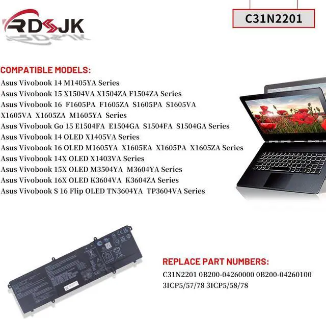 Compatible Models: Replacement for Asus Vivobook 14 M1405 M1405YA Series, for Asus Vivobook 15 X1504 X1504VA X1504ZA F1504 F1504ZA Series, for Asus Vivobook 16 F1605 F1605PA F1605ZA S1605PA S1605VA X1605VA X1605ZA M1605 M1605YA Series, for Asus Vivobook Go 15 E1504 E1504FA E1504GA S1504FA S1504GA Series, for Asus Vivobook 14 OLED X1405VA Series, for Asus Vivobook 16 OLED M1605YA X1605 X1605EA X1605PA X1605ZA Series, for Asus Vivobook 14X OLED X1403VA Series, for Asus Vivobook 15X OLED M3504YA M3604YA Series, for Asus Vivobook 16X OLED K3604 K3604VA K3604ZA Series, for Asus Vivobook S 16 Flip OLED TN3604YA TP3604VA Series