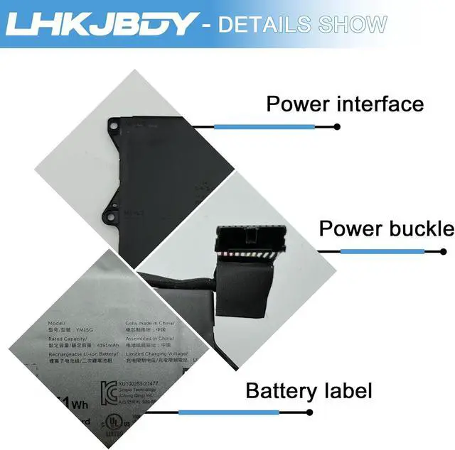 Specifications: Type: YM15G; Voltage: 11.55V; Capacity: 4191mAh/51Wh; Color: Black. Battery type: Lithium-Ion; The Packages includes: 1pcs YM15G Laptop Battery Replacement, 2pcs Screwdrivers, 1 pcs Instruction for YM15G Battery. The batteries are certified by UL and CE, ensuring safety and high performance