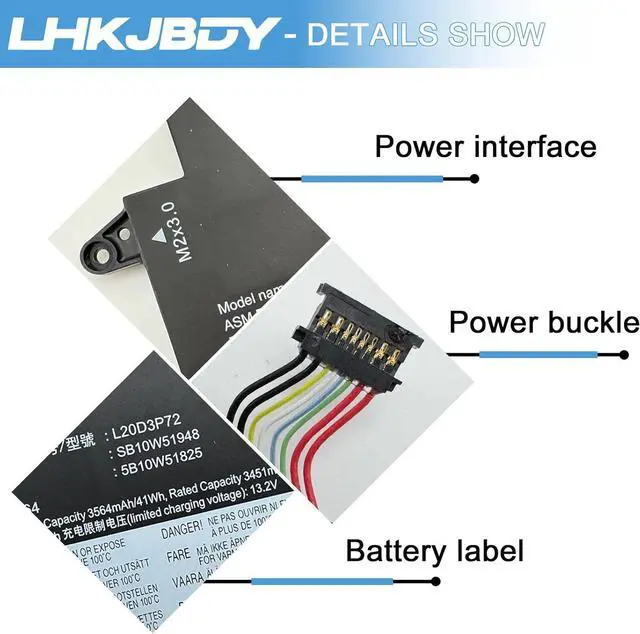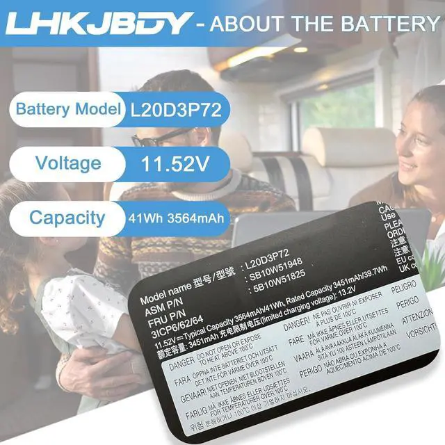 Specifications: Type: L20D3P72; Voltage: 11.52V; Capacity: 3564mAh/41Wh; Color: Black. Battery type: Lithium-Ion; The Packages includes: 1pcs L20D3P72 Laptop Battery Replacement, 2pcs Screwdrivers, 1 pcs Instruction for L20D3P72 Battery. The batteries are certified by UL and CE, ensuring safety and high performance