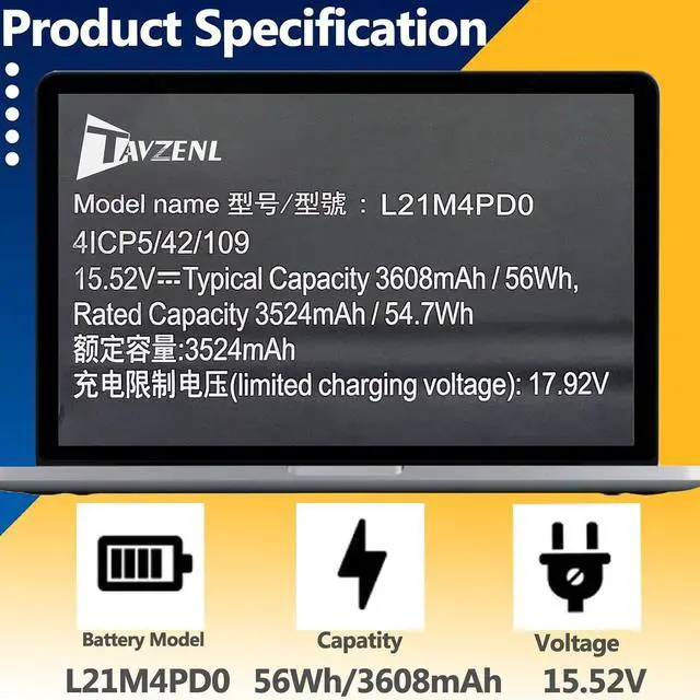 SpecificationsModel: L21M4PD0 Capatity: 56Wh/3608 Voltage:15.52V Battery type: Rechargeable Battery Color: Black 100% brand New from Manufacturer.