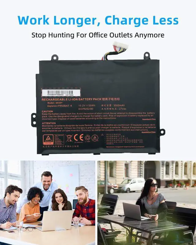 SPECIFICATION : Model Name:P950BAT-4 Voltage: 15.2 V.Capacity: 55Wh/3500mAh Grade A cells ensure fast charges and low power consumption; Built-in circuit protection ensures both safety and stability. Condition: 100% New; Battery life: More than 1000 cycles.