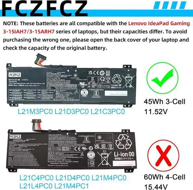 Compatible with Machine Modelsfor Lenovo IdeaPad Gaming 3-15IAH7 (Type: 82S9, 82UJ) series; for Lenovo IdeaPad Gaming 3-15ARH7 (Type: 82SB, 82UK) series; (Note: Gaming 3-15IAH7 and Gaming 3-15ARH7 laptop has 2 different capacity batteries (45Wh 60Wh). To save your time and money, please open the laptop back cover to confirm your battery is the same as described in the picture before ordering.)