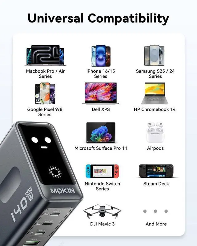 140W Ultra-Fast USB-C ChargerStop waiting hours to recharge. Our mokin 140W USB-C charger refuels your MacBook Pro (0-50% in ~25 min) and the latest iPhone 17 series (0-50% in ~20 min) at breathtaking speed.Equipped with two high-speed USB-C ports, each capable of delivering up to 140W. Either port can serve as a full-power USB C laptop charger, perfect for super fast charging your MacBook, Dell XPS, or other high-performance laptops.