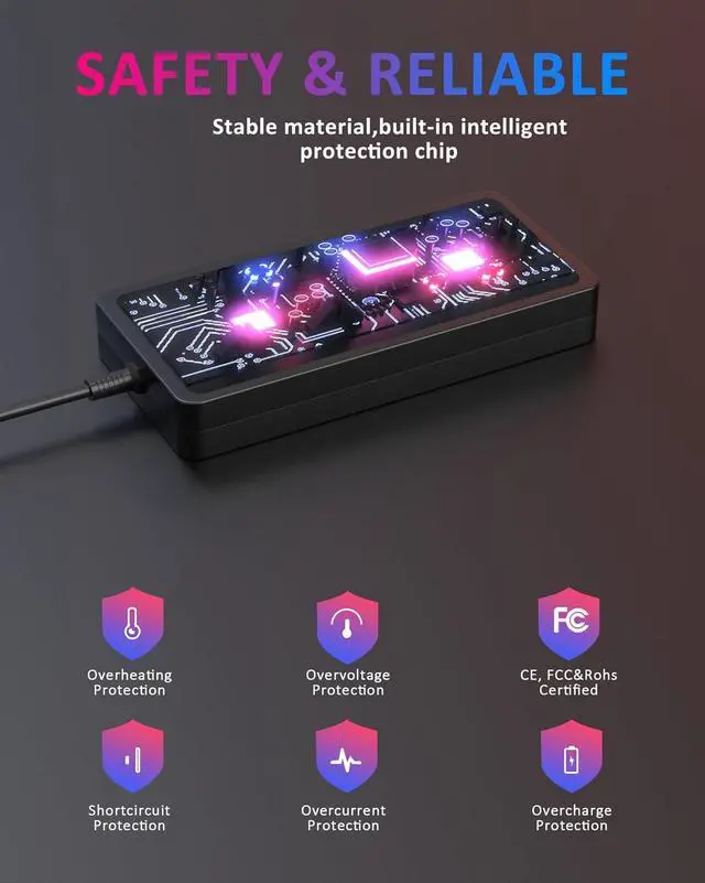Nivjuky 280W Laptop Chrager combines high-quality fireproof materials and built-in smart chips to create multiple protections including Over-Charge Protection, Over-Voltage Protection, Over-Temperature Protection, Over-Current Protection, Short-Circuit Protection, Lightning Protection