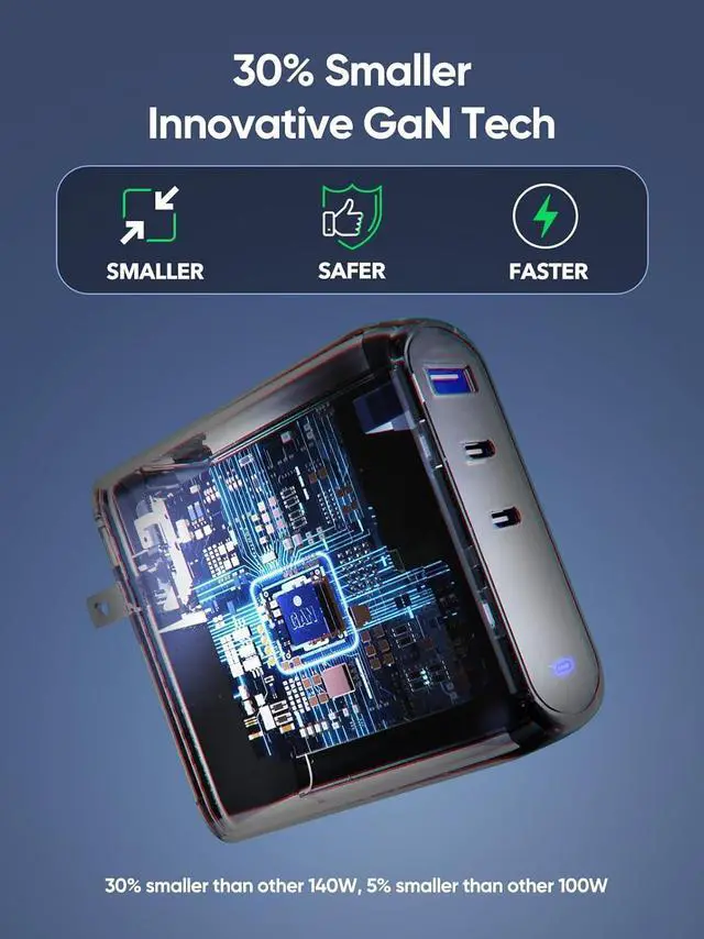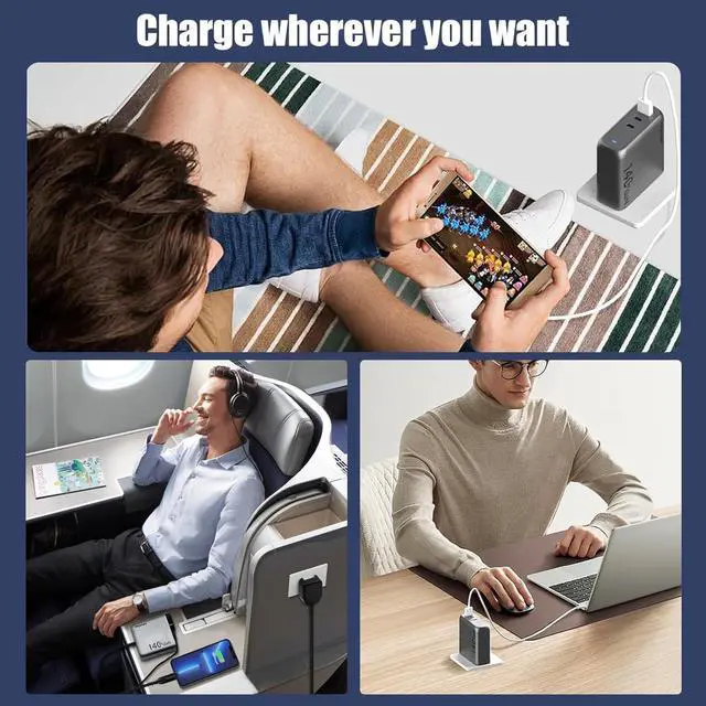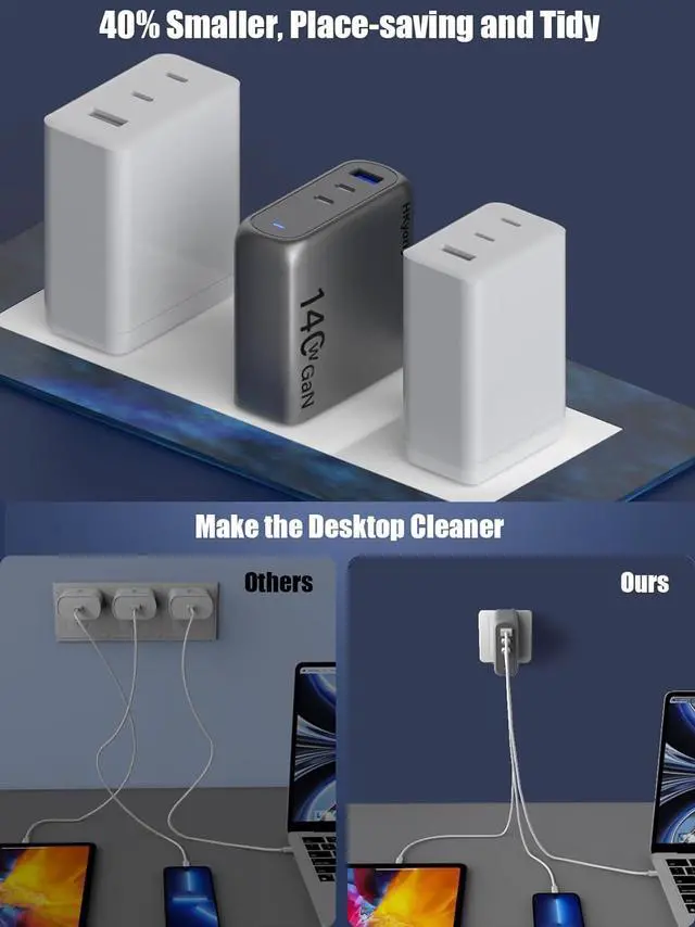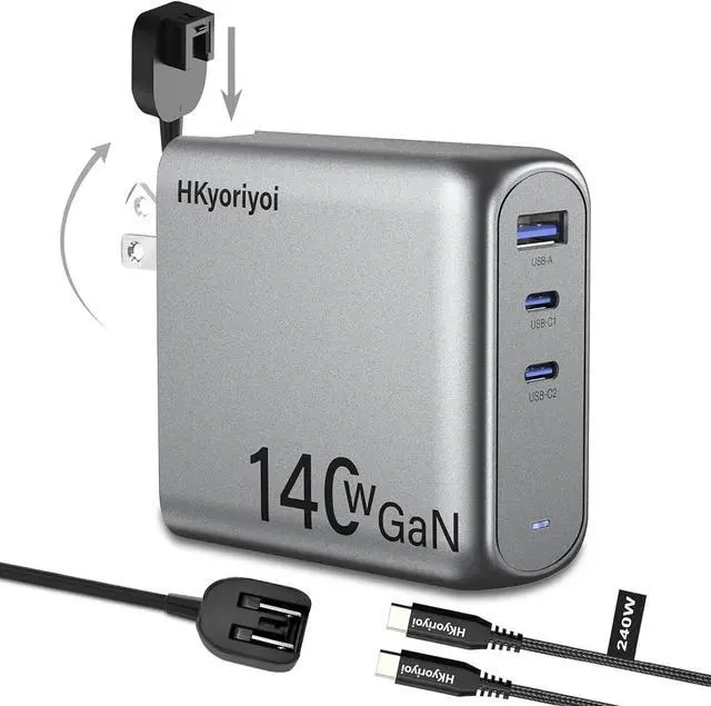 1HKyoriyoi 140W Charger2Charge 3 Devices at Once3Portable PD3.1 charger1The Latest GaN Chip2Wide compatibility 1One-Port charging2Two-Port charging3Three-Port charging Input100-240V 50/60Hz 2A MaxOutputUSB-A :5V/3A 9/2A 12V/1.5A(18WMax) USB-C1:5V/3A 9/3A 12V/3A 15V/ 3A 20V/5A 28V/5A(140W Max)USB-C2:5V/3A 9/3A 12V/3A 15V/ 3A 20V/5A 28V/5A(140W Max)Total Output140W MaxProtectionInput Overvoltage Protection, Output Overcurrent/Overvoltage/Over Temperature/Short Circuit ProtectionCase temperature75 Max (ambient temperature 23, 140W full load test)Operating temperature-10~40 Storage temperature-20~80 LaptopsCompatible with MacBook Pro 16", MacBook Pro 14", MacBook Pro 13", MacBook Air, Dell XPS/Inspiron/Latitude, HP Spectre/Elite, Google Pixelbook, Chromrbook, Microsoft Surface Book 2, Lenovo ThinkPad, Samsung Galaxy Book, etc.TabletCompatible with iPad 12.9", iPad Pro 11", iPad mini 5, iPad Air 3, etc.PhoneCompatible withiPhone 16 Pro / iPhone 16 Plus / iPhone 16/iPhone 15/iPhone 15 Pro/iPhone 15 Pro Max/ 14 / 13 Mini / 13 Pro / 13 Pro Max, iPhone 12 / 12 mini / 12 Pro / 12 Pro Max, iPhone SE , iPhone XS / XS Max / XR / X, iPhone 8 Plus / 8; Samsung Galaxy S23 Ultra/S23 / S22+ / S21 / S21+ / S20 / S20+ / S20 Ultra / S10 / S10e / S10+ / S9 / S9+ / S8 / S8+ / Note 20 Ultra / Note 20 / Note 10 / Note 9 / Note 8; Google Pixel / Pixel 3XL / 3 / 2XL / 2, Sony Xperia, LG G7 / V30+, and more.OthersCompatible with Switch Host, Switch Dock, DJI Mavic 3 / Air 2S, AirPods, Apple Watch, Steam Deck, etc.Note 1When multiple devices are connected at the same time, plugging a new device in or unplugging any of the devices from the charger will render a short charging pause for other devices. This short pause is due to the power redistribution of the charger.Note 2Dell XPS 15 series cannot charge at full speed due to Dell's proprietary fast charging protocolNote 3Please unplug the cable if it is not in use in case the max output power of other ports is restricted.Note 4Due to MacBook charging identification, it is normal to see a plug symbol in the battery icon when charging a MacBook with a third-party wall charger. Charging will revert to normal automatically after around one minute. Why does it sometimes wakeup my device when plugging or unplugging another device?