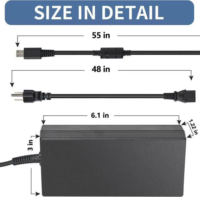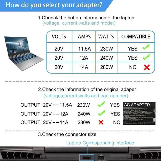 Power: 240W 20V 12A / 230W 20V 11.5A (not 19.5v 11.8a), DC size: USB tip (not 5.5*2.5mm),