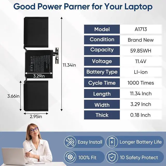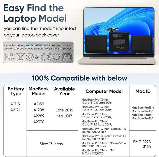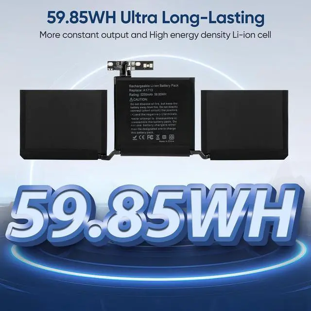 Battery Model A1713/A2171 Capacity 5250mAh 59.85WhVoltage 11.4V Compatible MacBook Pro 13-inch 2016/2017/2019/2020/2022MacBook Model No. A1708/A2159/A2289/A2338Model Identifier MacBookPro13,1/MacBookPro14,1/MacBookPro15,4/MacBookPro16,3/MacBookPro17,1/Mac14,7 EMC 2978/3164/3301/3456/3578/8162 Part No.(2016) MLL42xx/A, MLUQ2xx/A Part No.(2017) MPXQ2xx/A, MPXR2xx/A, MPXT2xx/A, MPXU2xx/A Part No.(2019) MUHN2xx/A, MUHP2xx/A, MUHQ2xx/A, MUHR2xx/A, MUHR2xx/B Part No.(2020)MXK32xx/A, MXK52xx/A, MXK62xx/A, MXK72xx/A, MYD83xx/A, MYD92xx/A, MYDA2xx/A, MYDC2xx/A Part No.(2020,M1) MYD83xx/A, MYD92xx/A, MYDA2xx/A, MYDC2xx/A Part No.(2022,M2) MNEH3xx/A, MNEJ3xx/A, MNEP3xx/A, MNEQ3xx/A 59.85Wh High-Capacity Macbook Pro Battery - 100% compatible & Safe Use Replacement Battery for Macbook Pro 13 Inch