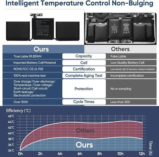 Tested for more than 1500 hours,11.4V, 59.85Wh, which lasts longer than the original battery