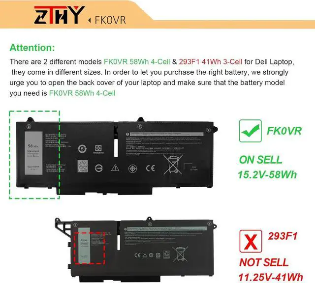 Compatible Part NumberFK0VR FKOVR FKOVR 07KRV 293F1 HFN8K 8H6WD PX0GF 01VX5 404T8 51R71 8P81K 8WRCR H4PVC M69D0 Y86WG 4FVJG 08P81K 0HFN8K 08H6WD 0PX0GFCompatible ModelReplacement for Dell Latitude 5330 5430 7330 7430 7530 Series; Compatible ModelReplacement for Dell Latitude 5330 7330 7430 2-in-1 Series; Compatible ModelReplacement for Dell Precision 15 3570 Mobile Workstation Series;Compatible ModelReplacement for Dell P104F P104F005 P104F006 Series; Compatible ModelReplacement for Dell P110F P110F002 Series; Compatible ModelReplacement for Dell P133G P133G002 Series;Compatible ModelReplacement for Dell P134G P134G002 Series; Compatible ModelReplacement for Dell P135G P135G002 Series; Compatible ModelReplacement for Dell P136G P136G002 Series; Compatible ModelReplacement for Dell P137G P137G005 Series; Compatible ModelReplacement for Dell P138G P138G002 Series; Compatible ModelReplacement for Dell P139G P139G002 Series. NoteNot Replacement for Dell Latitude 5430 Rugged Extreme Series; Not Replacement for Dell Latitude 7330 Rugged Extreme SeriesNoteThere are 2 different models FK0VR 58Wh 4-Cell & 293F1 41Wh 3-Cell for Dell Laptop, they come in different sizes. In order to let you purchase the right battery, we strongly urge you to open the back cover of your laptop and make sure that the battery model you need is FK0VR 58Wh 4-Cell. What do I need to be aware of when I receive a battery?