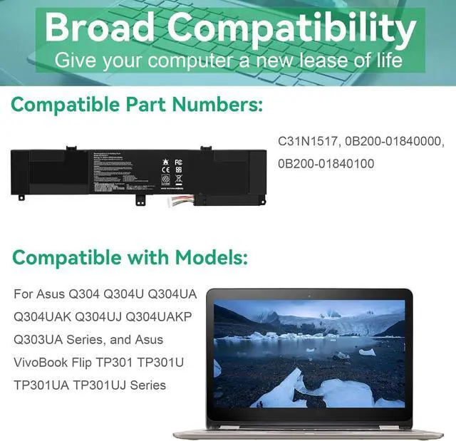 ASUS Q304U SeriesASUS Q304UA Series ASUS Q304UAK SeriesASUS Q304UJ Series ASUS Q303UA Series ASUS VivoBook Flip TP301 SeriesVivoBook Flip TP301UA Series:TP301UA-1A TP301UA-1B TP301UA-2C TP301UA-6200 TP301UA-6500 TP301UA-DW009R TP301UA-DW066T TP301UA-DW235T TP301UA-DW009T.VivoBook Flip TP301UJ Series:TP301UJ-1A TP301UJ-1B TP301UJ-C4011T TP301UJ-DW026T TP301UJ-C4011R TP301UJ-DW027T TP301UJ-DW054T. C31N1517 Laptop Battery Compatible with ASUS VivoBook Flip Build high-quality batteries for you Give your computer multiple protections C31N1517 Laptop Battery Easy & Quick Installation Grade "A" cells Top Quality Smart control Reassuring products Compatible Laptop Models(Use "Ctrl+F to find your model quickly)