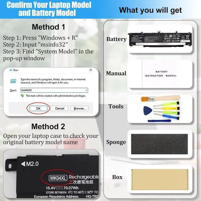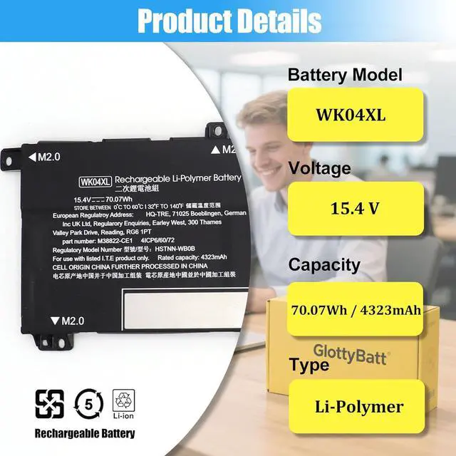 Battery ModelWK04XLBattery TypeLi-PolymerBattery Voltage15.4VBattery Capacity70.07W / 4323mAhBattery Condition100% Brand New From ManufacturerPackaging1* WK04XL Battery+1*Manual+1*Tool Kits Compatible Laptop Models (use "Ctrl+F to find your model quickly")