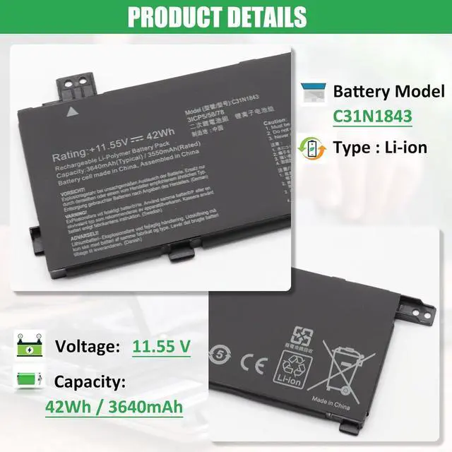 • BATTERY SPECIFICATION: Model Name: C31N1843; Voltage: 11.55V; Capacity: 42Wh / 3640mAh; Battery Type: Li-ion; Condition: 100% brand new from manufacturer; Color: Black; Packaged come with: 1*battery + battery installation screwdrivers + 1*instruction for laptop battery