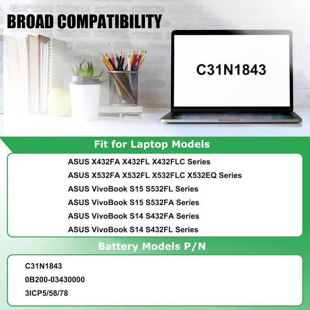 C31N1843 Laptop Battery Replacement for ASUS VivoBook S14 S432FA S432FL Vivobook S15 S532 S532FA S532FL X432FA X432FL X432FLC X532FA X532FL X532FLC S432FA-EB008T S532FA-DH55 Series 11.55V 42Wh