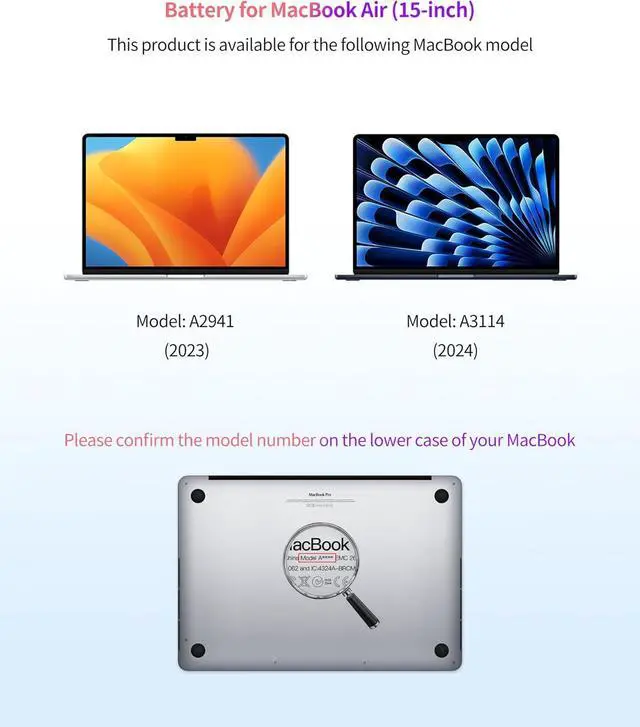 Battery ModelA2797Capacity6000 mAh 69.3 WhVoltage 11.55 VCompatibleMacBook Air 15-inch M2, 2023 / M3, 2024MacBook Model No. A2941/A3114Model IdentifierMac14, 15/Mac15, 13EMC8301/8612Part No. (2023) MQKP3xx/A, MQKQ3xx/A, MQKR3xx/A, MQKT3xx/A, MQKU3xx/A, MQKV3xx/A, MQKW3xx/A, MQKX3xx/APart No. (2024) MRYM3xx/A, MRYP3xx/A, MRYR3xx/A, MRYU3xx/A, MRYN3xx/A, MRYQ3xx/A, MRYT3xx/A, MRYV3xx/A, MXD13xx/A, MXD23xx/A, MXD33xx/A, MXD43xx/A