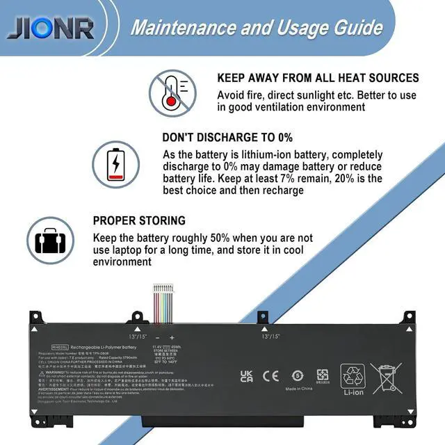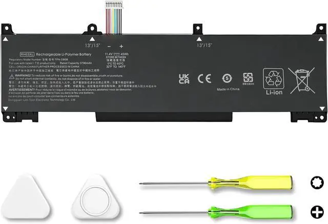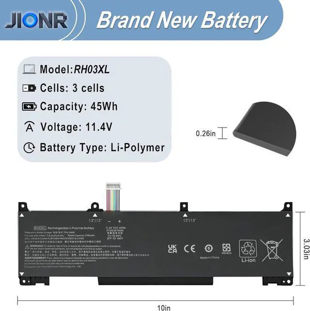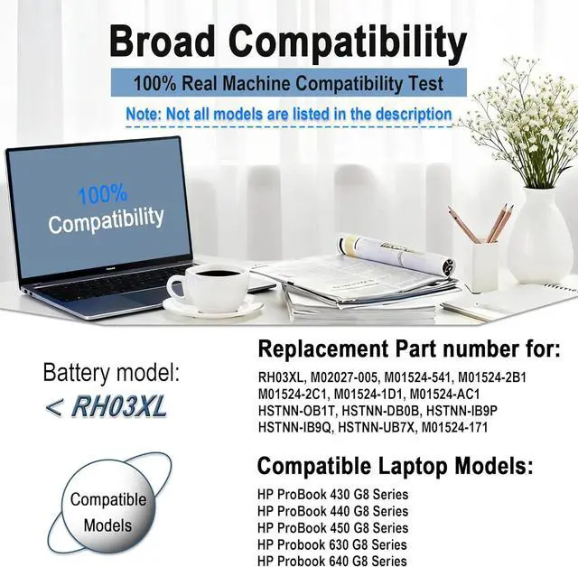 Battery Type:Rechargeable Li-ion Color: BlackModel: RH03XLVoltage:11.4VCapacity: 45Wh/3790mAhCondition: Grade A Cell / 100% brand New from ManufacturerCompatible Part Numbers RH03XL M02027-005 M75017-171 M75599-005 HSTNN-OB1TCompatible Part Numbers HSTNN-DB0B HSTNN-IB9P HSTNN-IB9Q HSTNN-UB7XCompatible Part Numbers M01524-171 M01524-541 M01524-2B1 M01524-2C1 RHO3XLCompatible Part Numbers M01524-1D1 M01524-AC1 TPN-IB0L TPN-DB0B 3ICP6/59/74Compatible ModelsFor HP ProBook 430 440 445 455 630 640 645 650 655 G8 G9 G10 series. Compatible Models