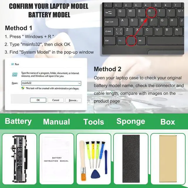 Method 1: Check your laptop model name by pressing [Win] + [R] key and entering [msinfo32] or [dxdiag], click OK to find your System Model. Then use your laptop model name to search the correct replacement battery