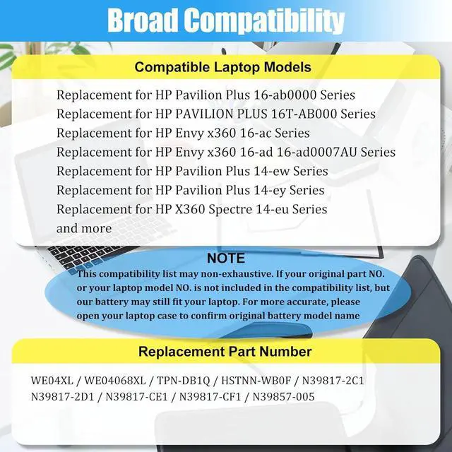 COMPATIBLE LAPTOP MODELS: This Laptop battery WE04XL replacement for HP Envy X360 16-AC 16-AD 2-in-1 Spectre X360 14-EU 2-in-1 Pavilion Plus 16-AB 16T-AB Pavilion Plus 14-EW 14-EY Series