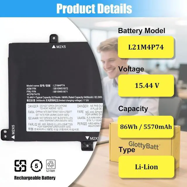 BATTERY SPECIFICATION: Model Name: L21M4P74; Voltage: 15.44V; Capacity: 86Wh 5570mAh; Battery Type: Li-ion; Condition: 100% brand new from manufacturer; Package include: 1*battery + battery installation screwdrivers + 1*instruction for laptop battery