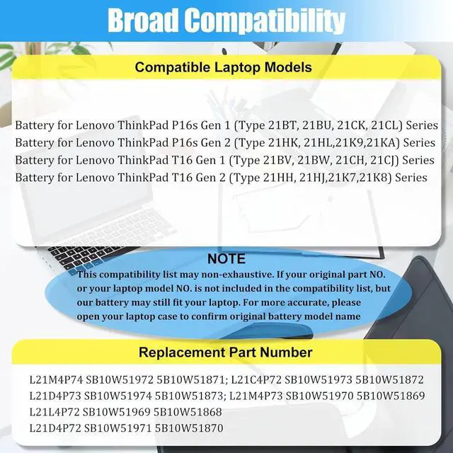 COMPATIBLE LAPTOP MODELS: This Laptop battery L21M4P74 replacement for Lenovo ThinkPad T16 Gen 1 (Type 21BV, 21BW, 21CH, 21CJ) Series; for Lenovo ThinkPad T16 Gen 2 (Type 21HH, 21HJ,21K7,21K8) Series; for Lenovo ThinkPad P16s Gen 1 (Type 21BT, 21BU, 21CK, 21CL) Series; for Lenovo ThinkPad P16s Gen 2 (Type 21HK, 21HL,21K9,21KA) Series