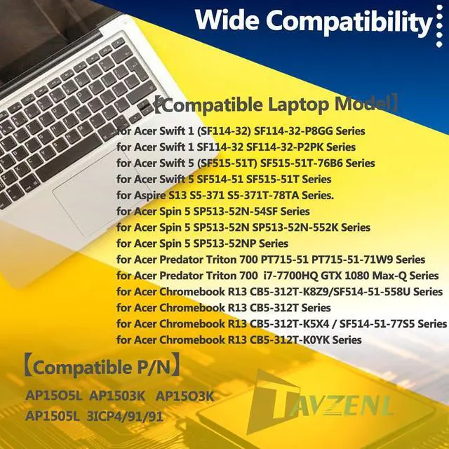 Compatible Modelfor Aspire S13 S5-371 S5-371T-78TA Series, Spin 5 SP513-52N-54SF Predator Triton 700 PT715-51 i7-7700HQ,GTX 1080 Max-Q, Swift 1 (SF114-32) SF114-32-P8GG Series, Swift 5 (SF515-51T) SF515-51T-76B6 Series, Chromebook R13 CB5-312T-K0YK Series.
