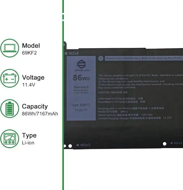 Model: 69KF2 // Voltage: 11.4V // Capacity: 86Wh 7167mAh // Color: Black // Type: Plug & Play Li-ion Battery.