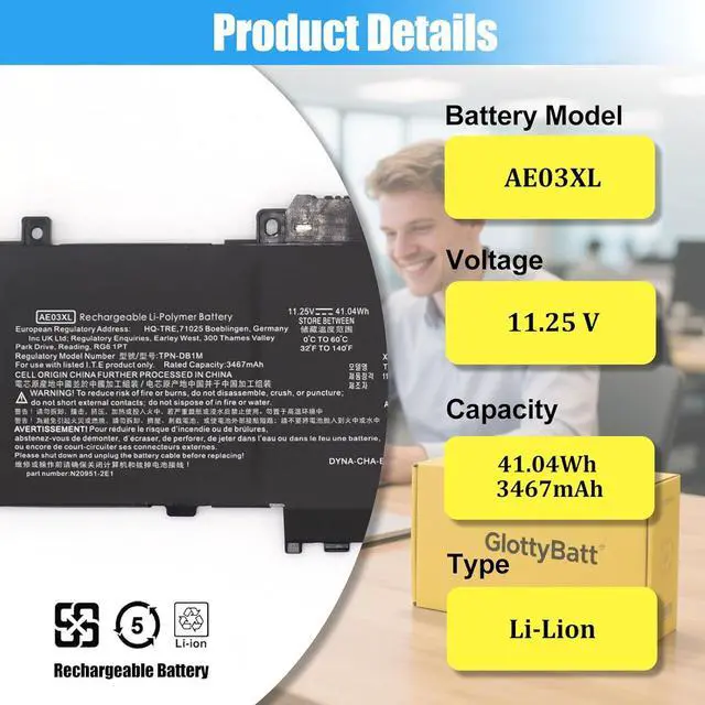 BATTERY SPECIFICATION: Model Name: AE03XL; Voltage: 11.25V; Capacity: 41.04Wh 3467mAh; Battery Type: Li-ion; Condition: 100% brand new from manufacturer; Package include: 1*battery + battery installation screwdrivers + 1*instruction for laptop battery