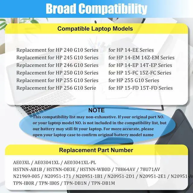 COMPATIBLE LAPTOP MODELS: This Laptop battery AE03XL replacement for HP 240 G10 Series; for HP 245 G10 Series; for HP 246 G10 Series; for HP 250 G10 Series; for HP 255 G10 Series; for HP 256 G10 Series; for HP 14-EE Series; for HP 14-EM 14Z-EM Series; for HP 14-EP 14T-EP Series; for HP 15-FC Series; for HP 15Z-FC Series; for HP 15-FD Series; for HP 15T-FD Series