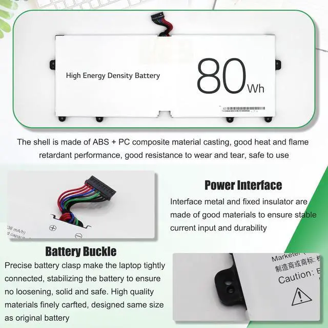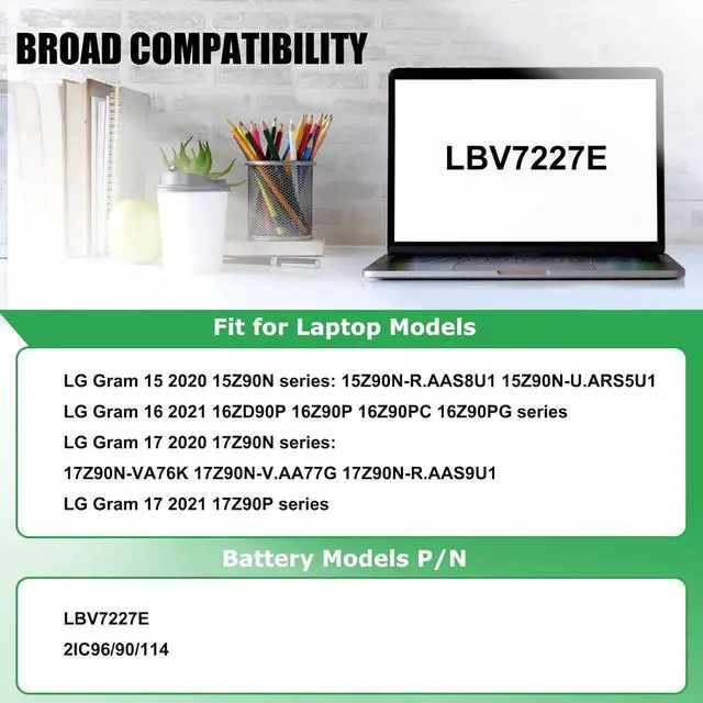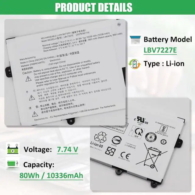 BATTERY SPECIFICATION: Model Name: LBV7227E; Voltage: 7.74V; Capacity: 80Wh / 10336mAh; Battery Type: Li-ion; Condition: 100% brand new from manufacturer; Color: Black; Packaged come with: 1*battery + battery installation screwdrivers + 1*instruction for laptop battery