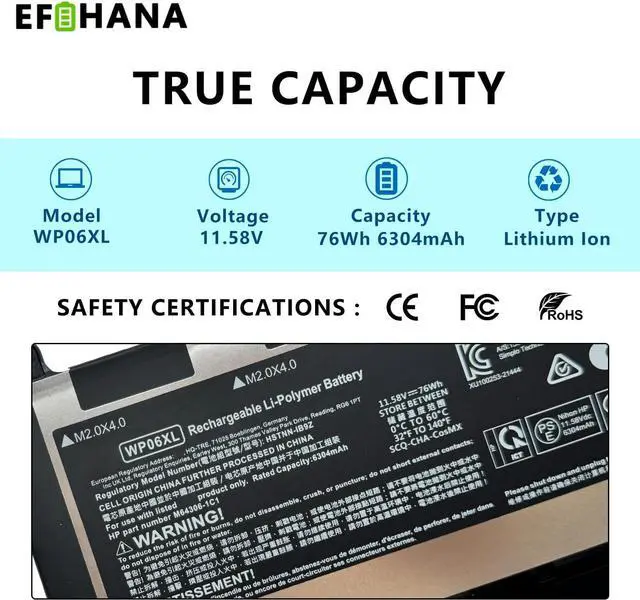 SpecificationsModel:WP06XL // Battery type: Li-ion // Voltage: 11.58V // Capacity: 76Wh/6304mAh // 100% New from Manufacturer. Top circuit boards and smart chip.