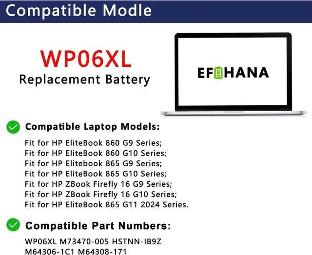 Compatible with Laptop ModelsFit for HP EliteBook 860 G9 Series;Fit for HP EliteBook 860 G10 Series; Fit for HP Elitebook 865 G9 Series;Fit for HP EliteBook 865 G10 Series;Fit for HP ZBook Firefly 16 G9 Series;Fit for HP ZBook Firefly 16 G10 Series; Fit for HP EliteBook 865 G11 2024 Series.